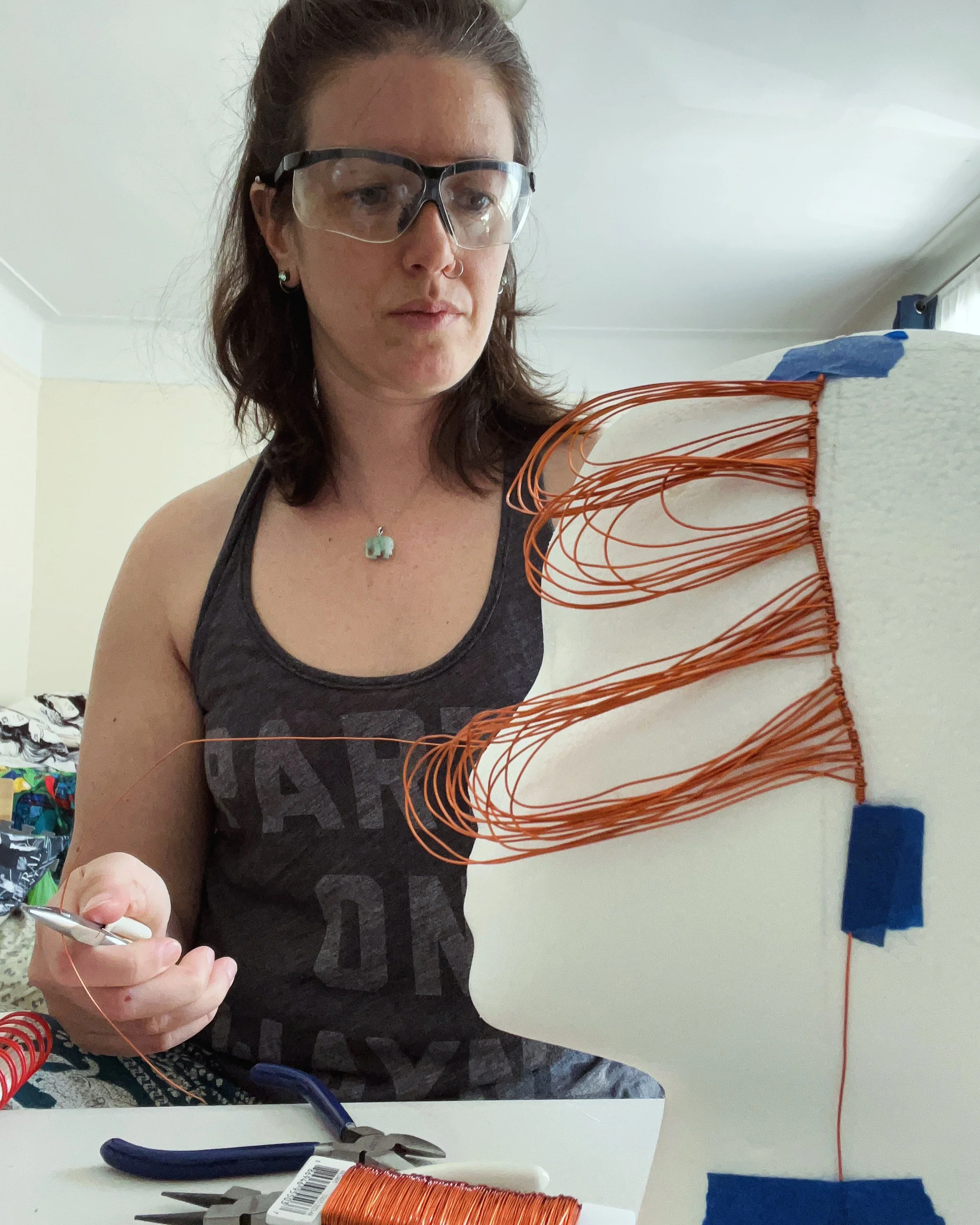Her work is a visual representation of processing experienced trauma and the accompanying desire to facilitate healing and understanding. An avid scholar with extensive coursework in fields including psychology, biology, and political science, she takes a holistic approach to creating work. Selecting various mediums, her works involve repetitive and meditative continuing motions in construction and mark making. She follows her intuition throughout, trusting the process.