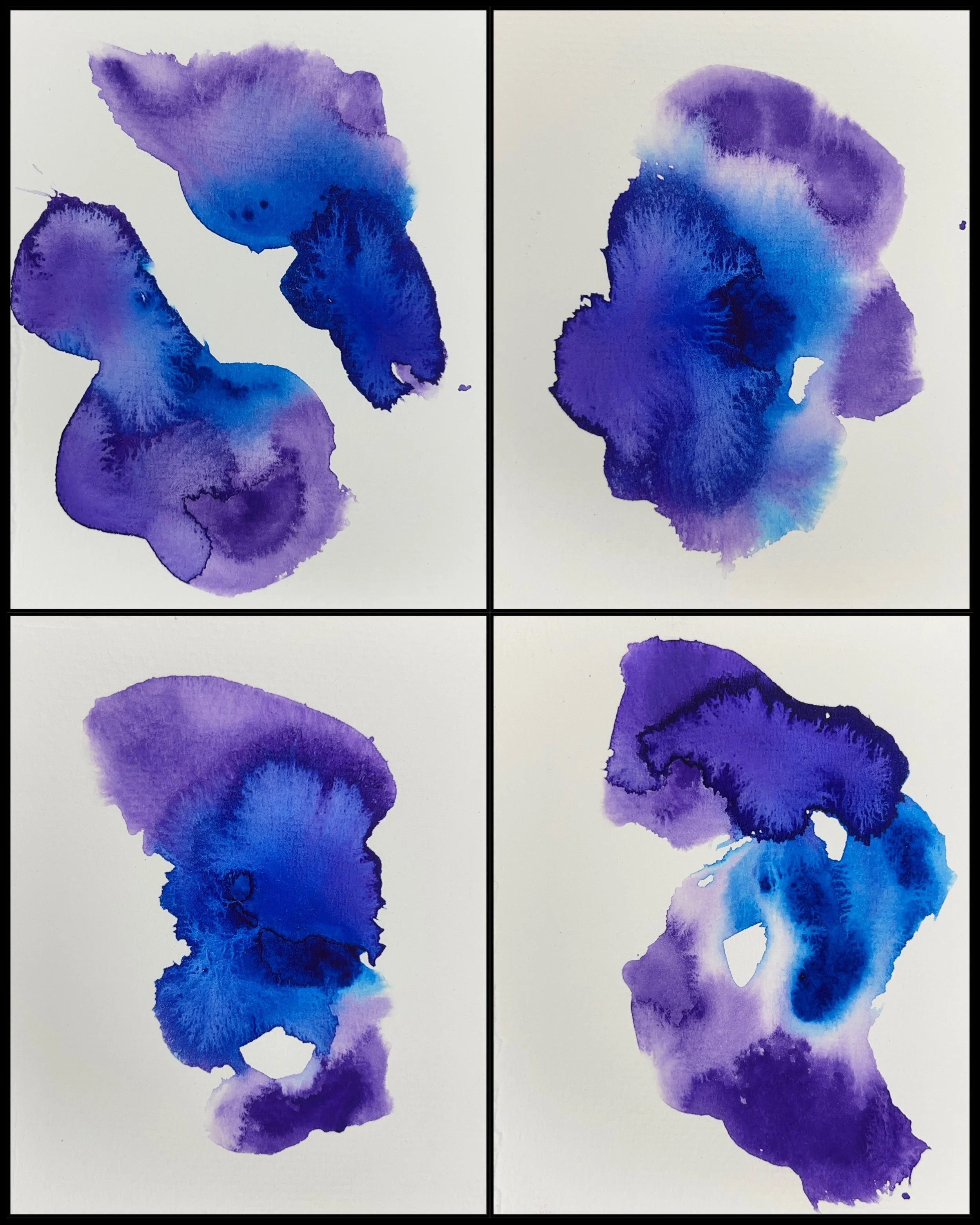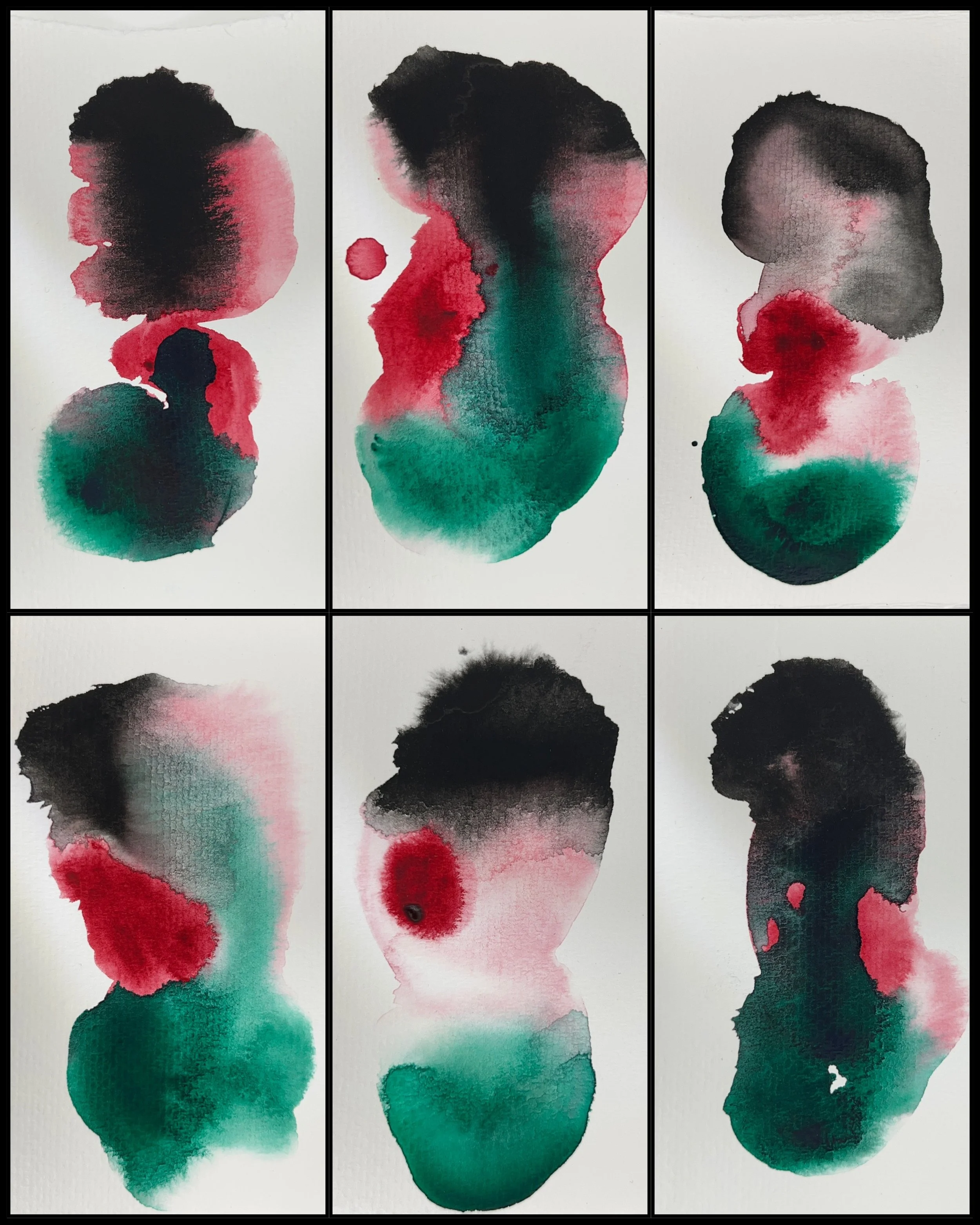 The Grief Scapes are a watercolor series I began after my mother succumbed to ovarian cancer on January 4, 2022. The impulse for this material was surprising to me, as I am generally a photographer and multimedia sculptor. I hadn’t touched watercolors in at least 20 years. Trusting the process, I thought of these small paintings- approximately 3.5”x5.5”- as little “scapes”; not quite defined as land/sea/sky-scapes but their own scenic auras. I realized, they were “grief scapes”; whole atmospheres in which expressions of loss and mourning have been released. The scale conveys the level of intimacy and vulnerability. The colors are chosen intuitively, sometimes in response to some emotional upheaval I need to process. Each set of 24-36 images per session has become a complete meditation. The number of small paintings in one set reveals my photography background; 24 exposures were on a roll of film and they are displayed in rows akin to printed contact sheets. Research shows that in grief, the brain reverts to its functioning before suffering major loss, and I have experienced the resurfacing of photography formats I began at a very young age. I continue to engage in this practice at least once a week, and the Grief Scapes have become a keystone series in exploring my Grief Journey.
